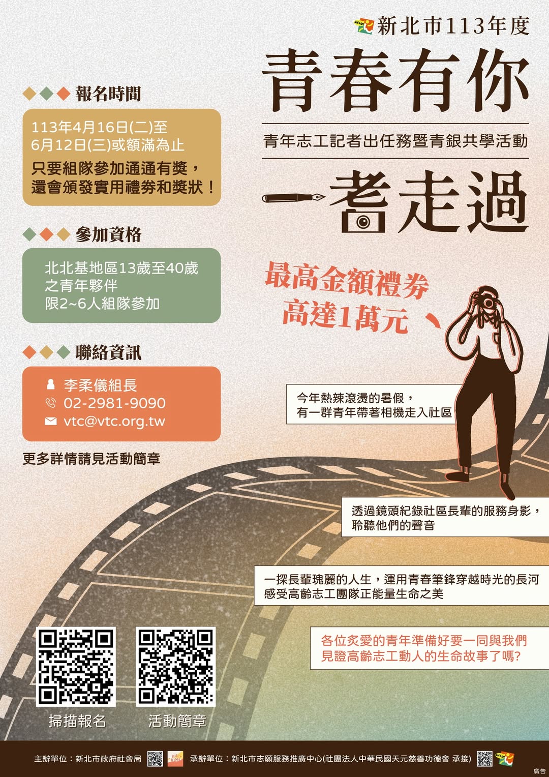 新北市政府社會局的志願服務推廣中心,即將在 7-8 月辦理青年志工活動啦~ 13-40歲的青年朋友們,只要組成2-6人的團隊,一起用鏡頭記錄長輩們的服務身影,就能爭取最高金額1萬元的禮券,而且組隊參加通通有獎喔! §活動詳情:https://vtc.org.tw/ch/modules/tadnews/index.php?nsn=2952 §報名網址:https://www.beclass.com/m/rid=284d70365ba1a9a091a4 §聯繫資訊:02-2981-9090 新北志推中心 李柔儀組長